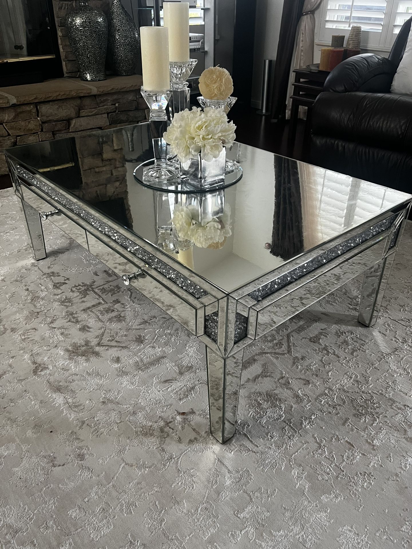 Luxurious Mirror Coffee Table Has 2 drawers on one side Mirror all around with crystals in between Looks Beautiful Has a crack on one of the legs at the bottom part, doesn’t really show that much, upper parts of the table are in pristine condition. Always has a protective clear film on top which does look a bit faded but keeps glass clean and pristine. Might come with it if interested $380 OBO