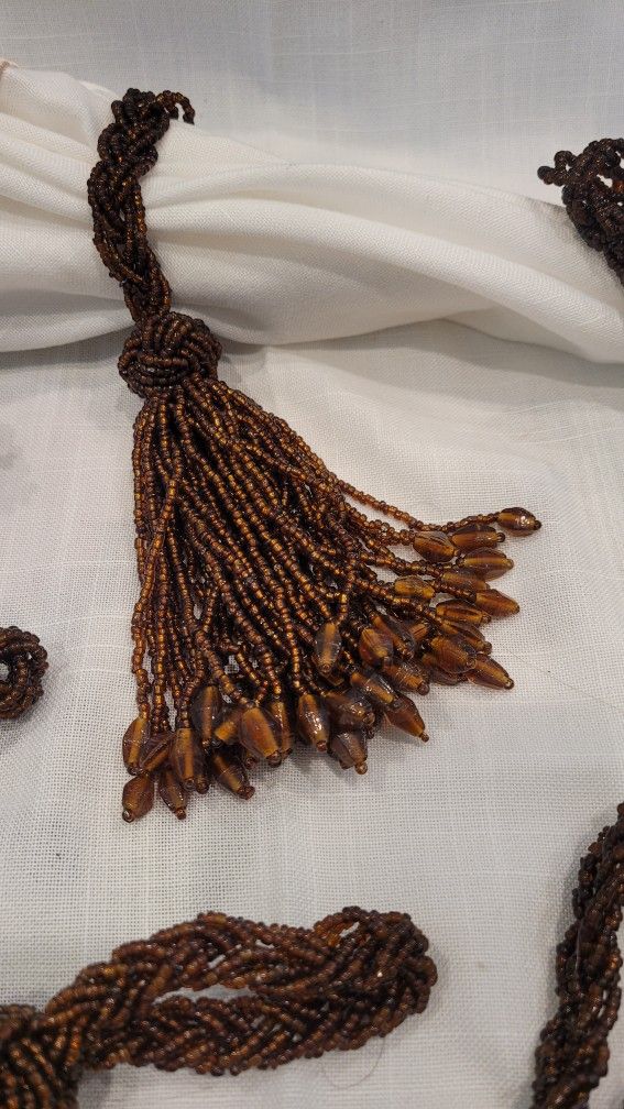 11 Brown Beaded Tassel Napkin Rings Can be used as Wine Bottle Toppers NEW!!! Multiple uses. Drawer pull and lamp jewelry Will break up the set. Will sell 4 @ $4