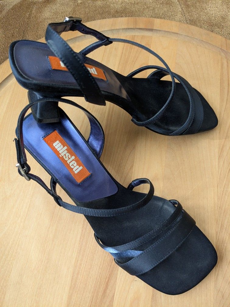 Unlisted brand; dressy sateen, adjustable strap, low heel; women's size 8.5; good condition. Cash only; arrange public meet up.