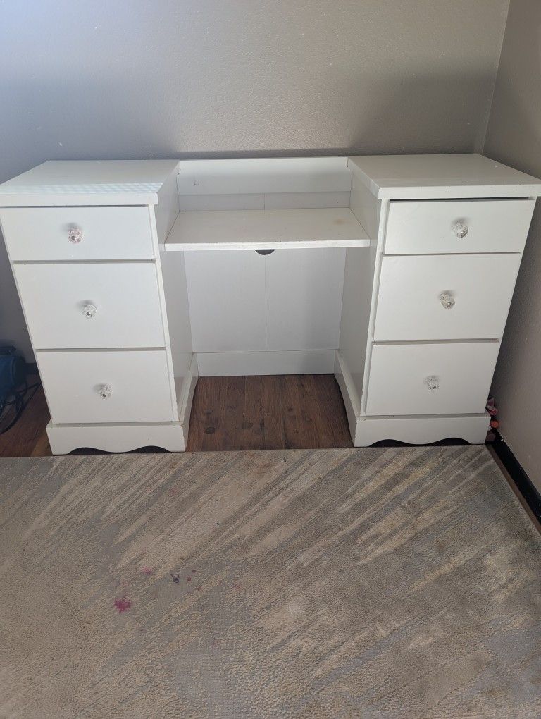 This vanity is in very good condition, All drawers work fine, very sturdy and heavy. The only thing is that it has paint on top as you can see in the pictures.