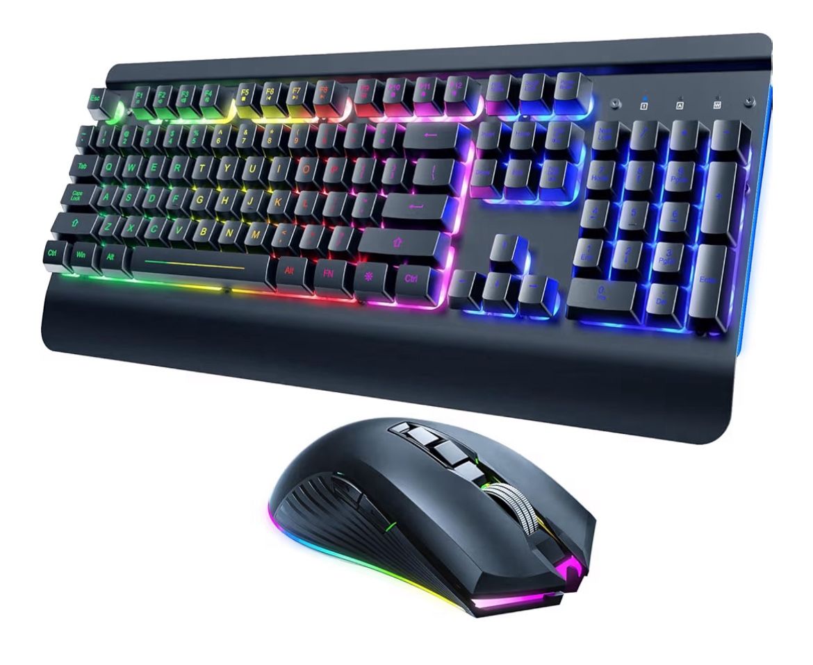 RisoPhy Wireless Gaming Keyboard and Mouse Combo, Metal Panel, 7 Color Backlits, Rechargeable 3200 mAh Battery, Wrist Rest, Sleep Mode, Light Up Keybo