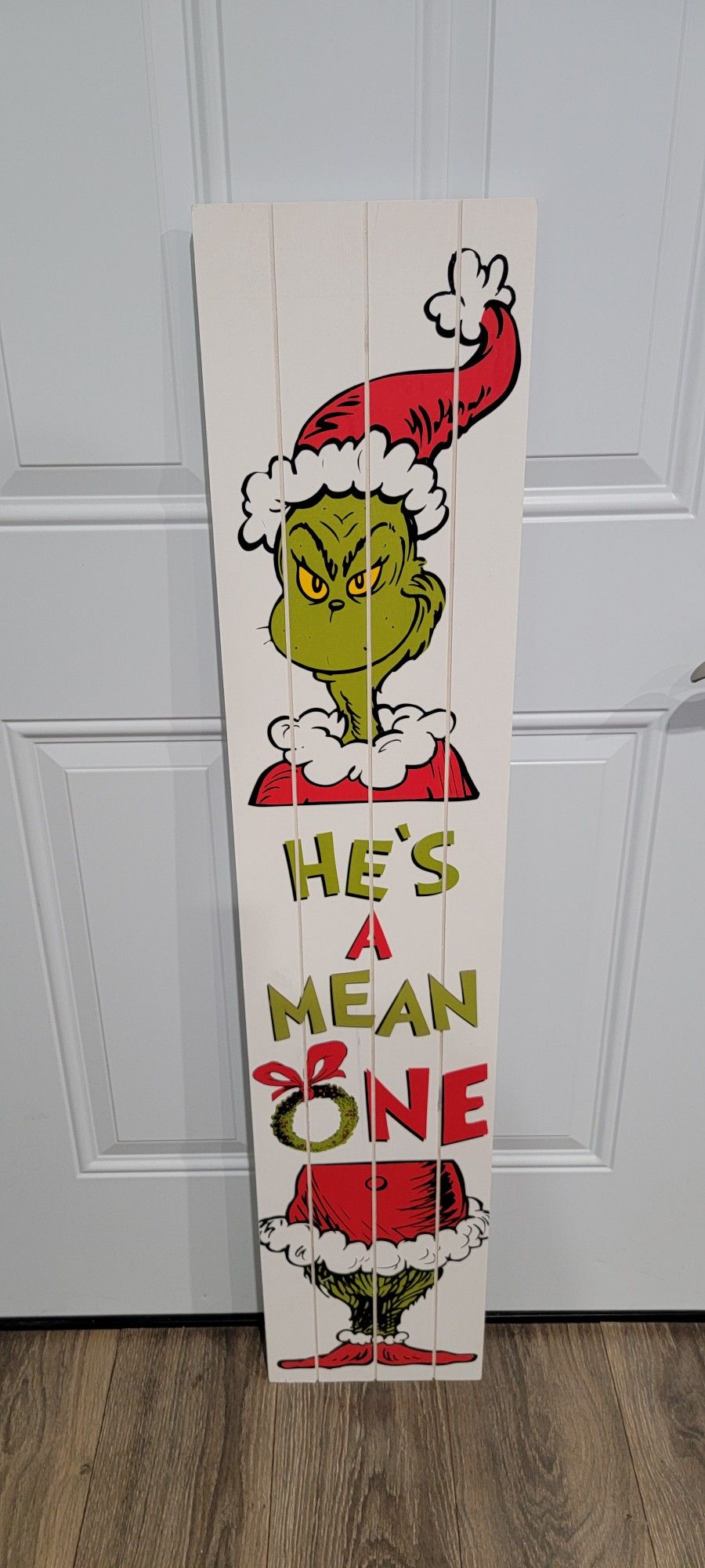 wooden sign features a "He's a mean one" message and smiling Grinch face. Use the attached rope to hang this sign indoors or out. Details: Multicolored 3 ft. x 11" x 9.5" Total of 1 piece Suitable for indoor and outdoor use Includes rope for hanging Wood