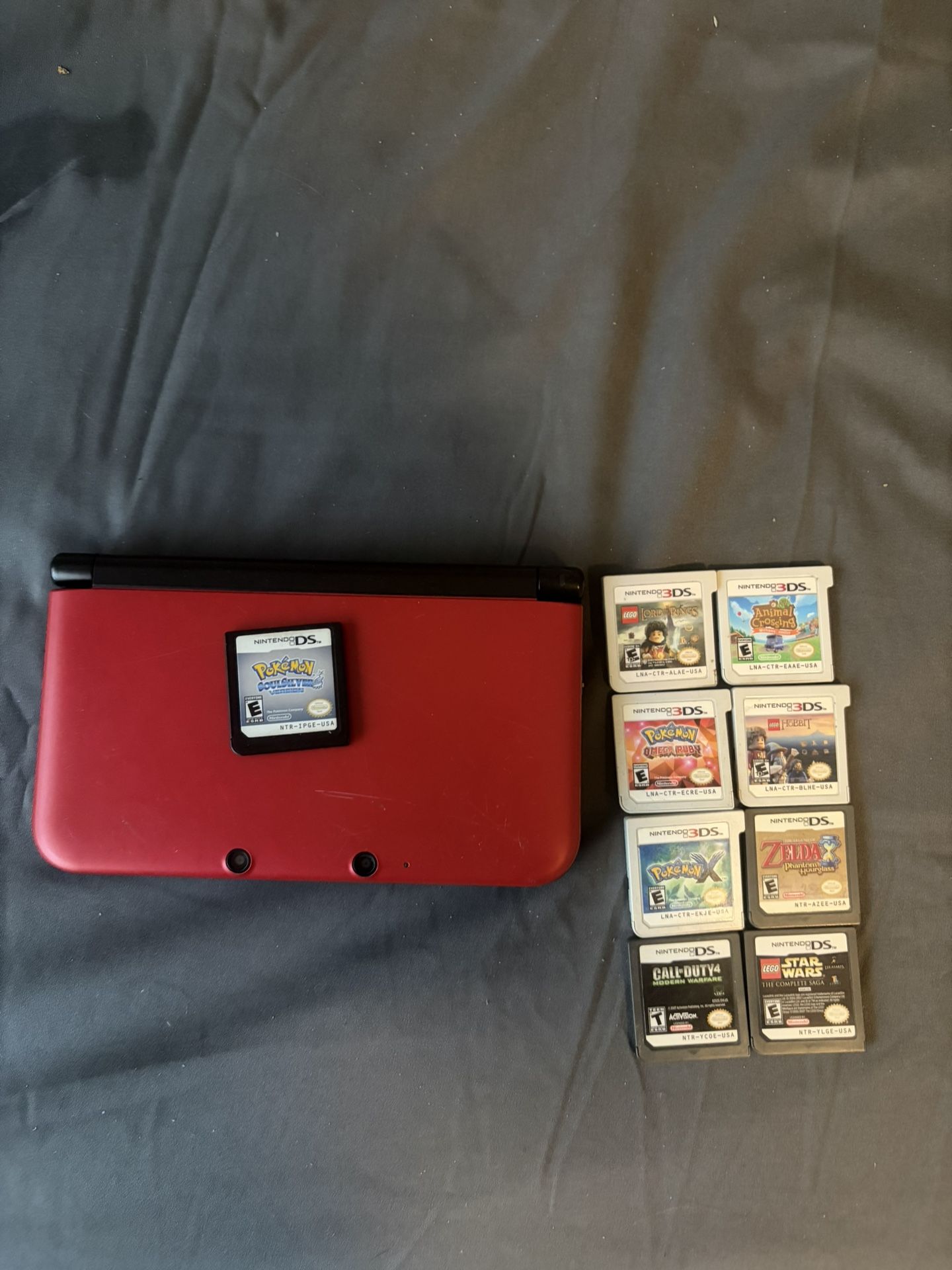 Red Nintendo 3DS XL in good working condition with cosmetic wear consistent with regular use All buttons, screens, speakers, and hinges function properly. Includes: Pokémon SoulSilver Pokémon X Pokémon Omega Ruby Animal Crossing: New Leaf LEGO Lord of the Rings LEGO Star Wars the Complete Saga Call of Duty 4: Modern Warfare Legend of Zelda: Phantom Hourglass Lego The Hobbit All cartridges are authentic Nintendo copies and tested working.