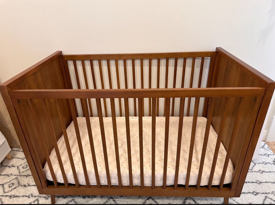 Mid century style crib from pottery barn, great condition, comes with mattress and washable cover. Easy assembly, you can fit it in the back of a car.