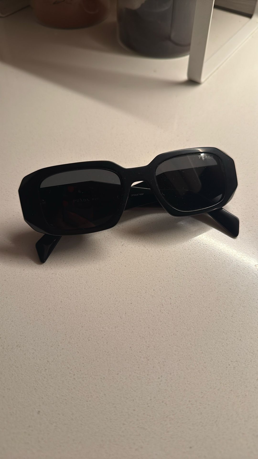 black used prada sunglasses, has some tiny scratches and some of the “prada” symbol on the left is peeled