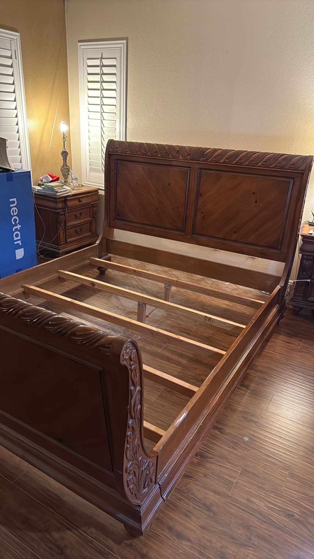 Solid wood bed frame with carved detailing on headboard. comes with vertical dresser, 2 night stands and horizontal dresser. Got new furniture. first come first serve