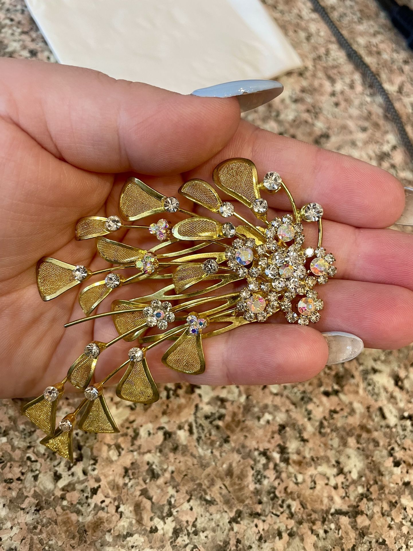 Euc There is one prong that is missing a crystal as shown but can easily be hidden in the hairstyle Gold color with crystals Hair comb accessory