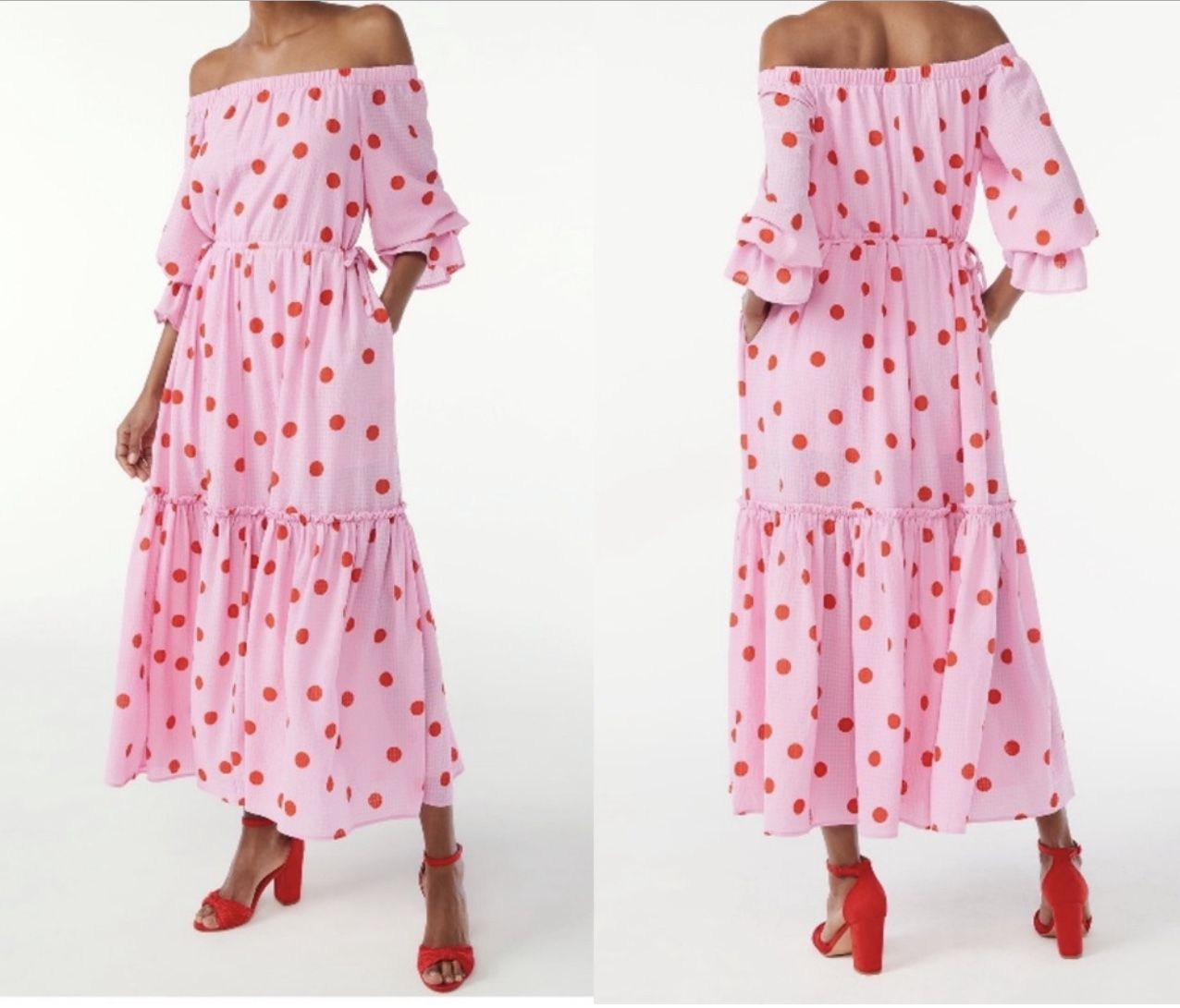 NWT Scoop Pink/Red Polka-Dot Off the Shoulder Maxi Dress with Ruffles and Pockets Beautiful and Flowing with Plenty of Frills and Ruffles, Adjustable Side Ties that Give a Cinched Look for a Perfect Shape and What Girl Doesn’t Love Pockets on a Great Dress 96% Polyester 4% Spandex Lining 100% Polyester Machine Washable Pull Over Style, Elbow-Length Sleeves with Elastic Cuffs and Ruffles, Elastic Waist Multiple Sizes Available XXL(20) XL(14) You Like the Item Don’t Like the Price Reasonable Offers Accepted