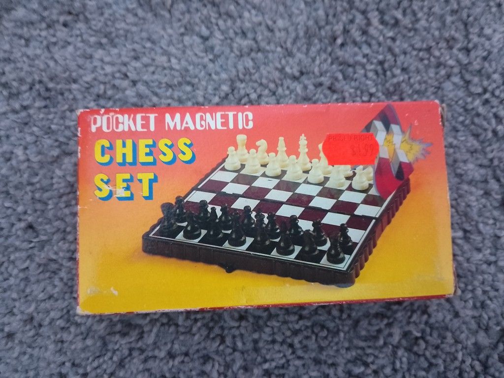 Vintage Pocket Magnetic Chess Set In Box! Both white and black chess pieces are factory reset only missing is instructions only asking 6.00 local pickup only thank you :)