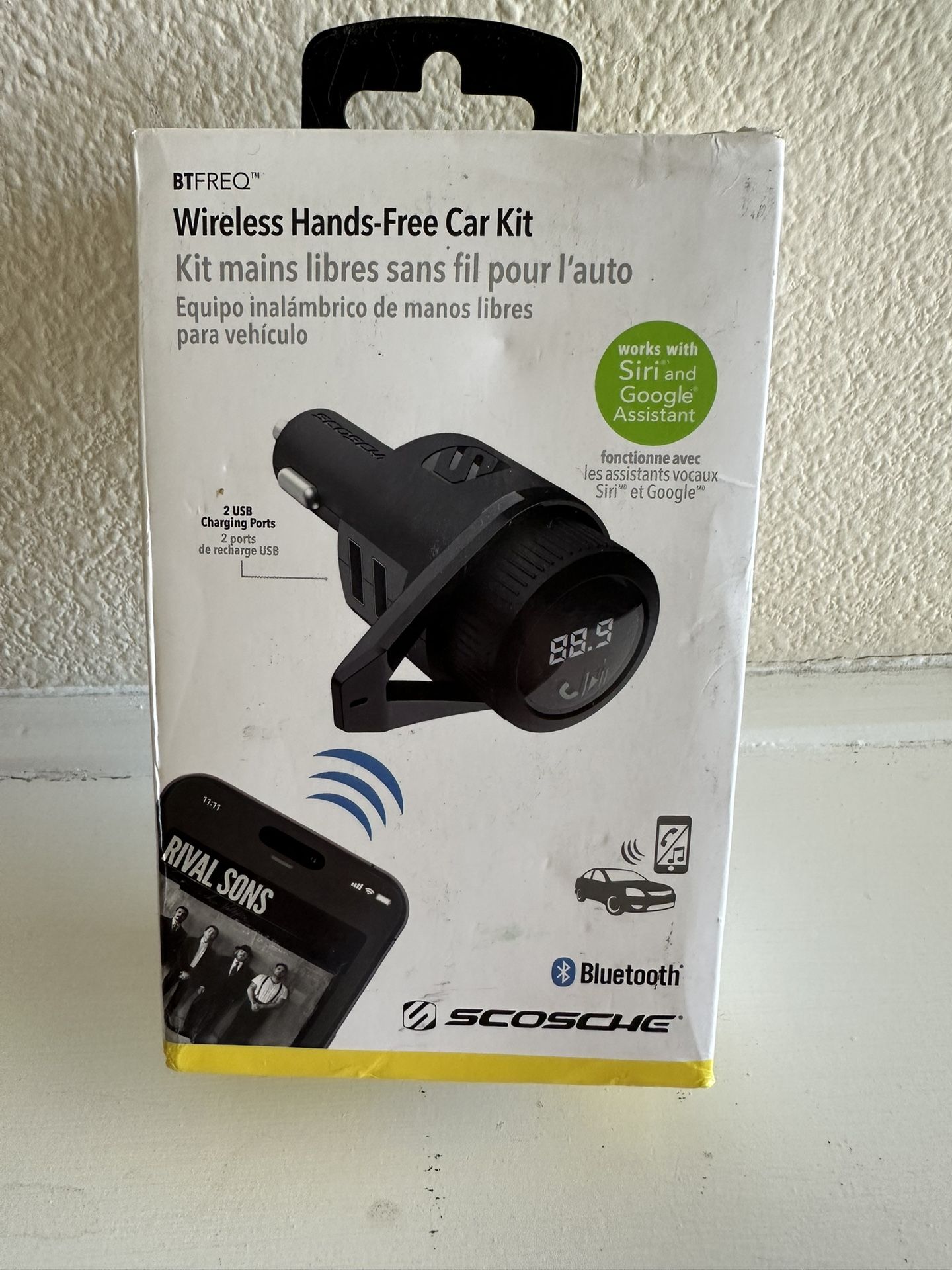 Plugs into your cig lighter and line it up with a radio station and play music from your phone