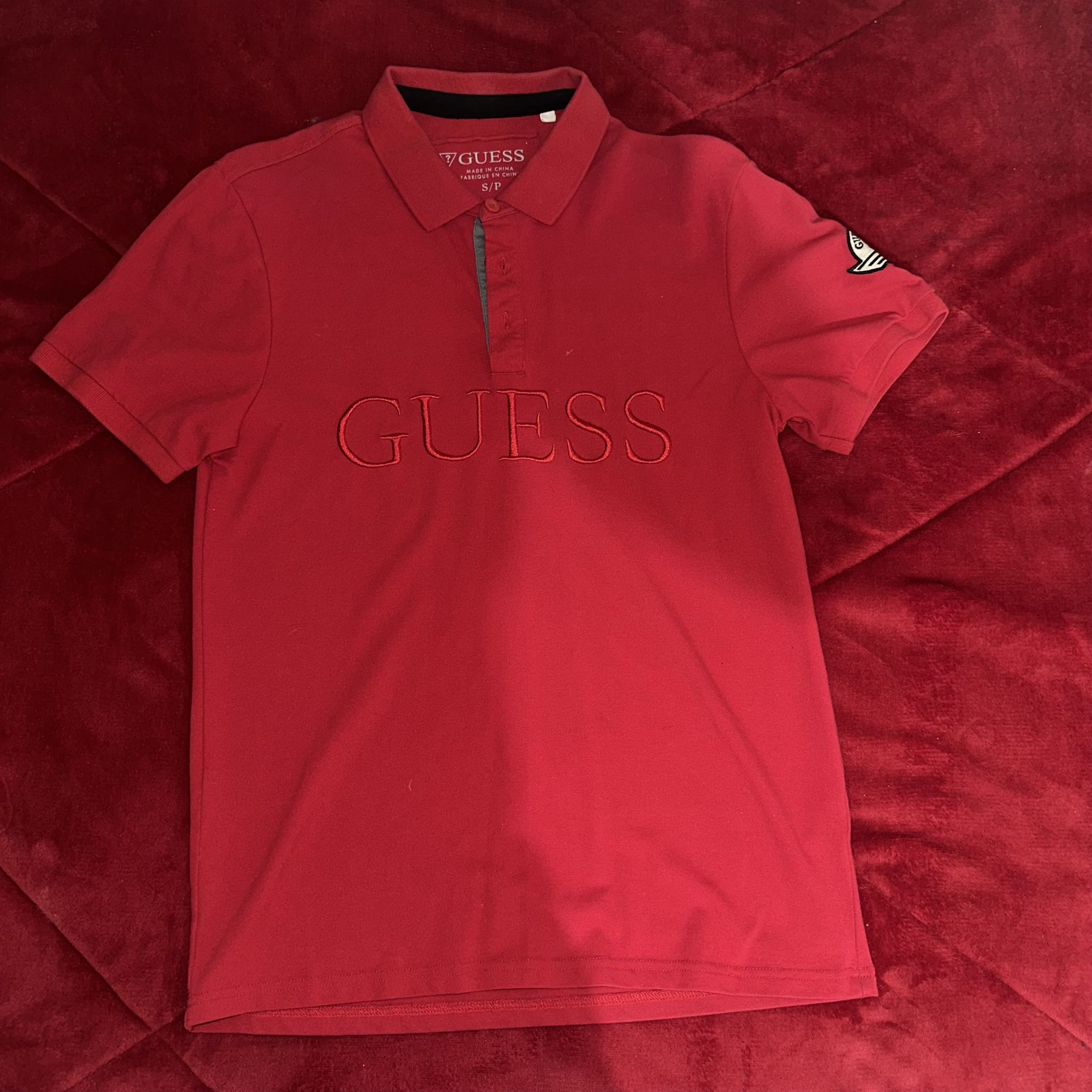 This is a red Guess polo shirt with an embroidered logo.
