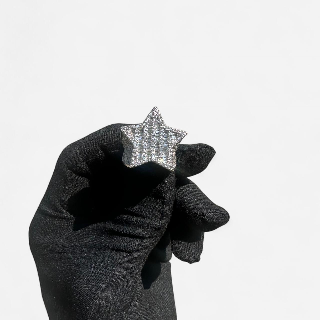bold, unique, and full of personality—this iced-out star ring is covered in shimmering simulated diamonds and made to stand out. gender neutral. size 10.