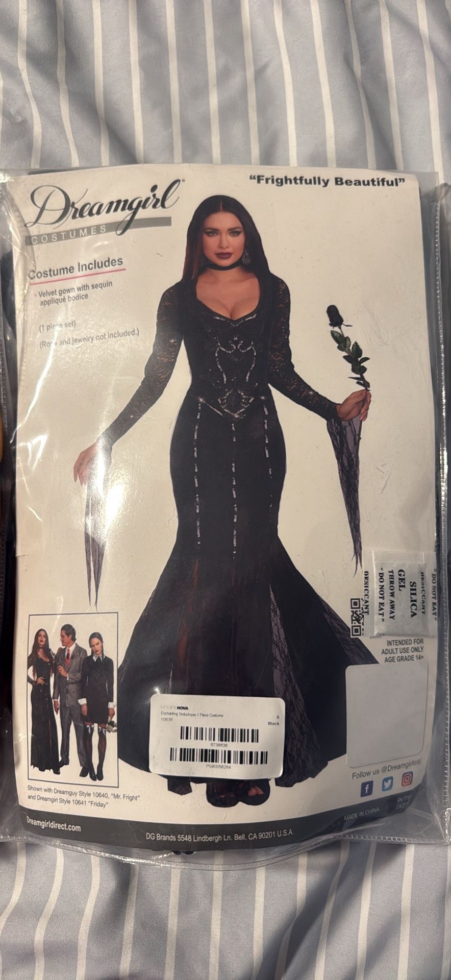 Brand new, still sealed. Kids Charizard costume, size L/G (10-12). Adult black dress costume, size S. Both have original packaging and are unused.