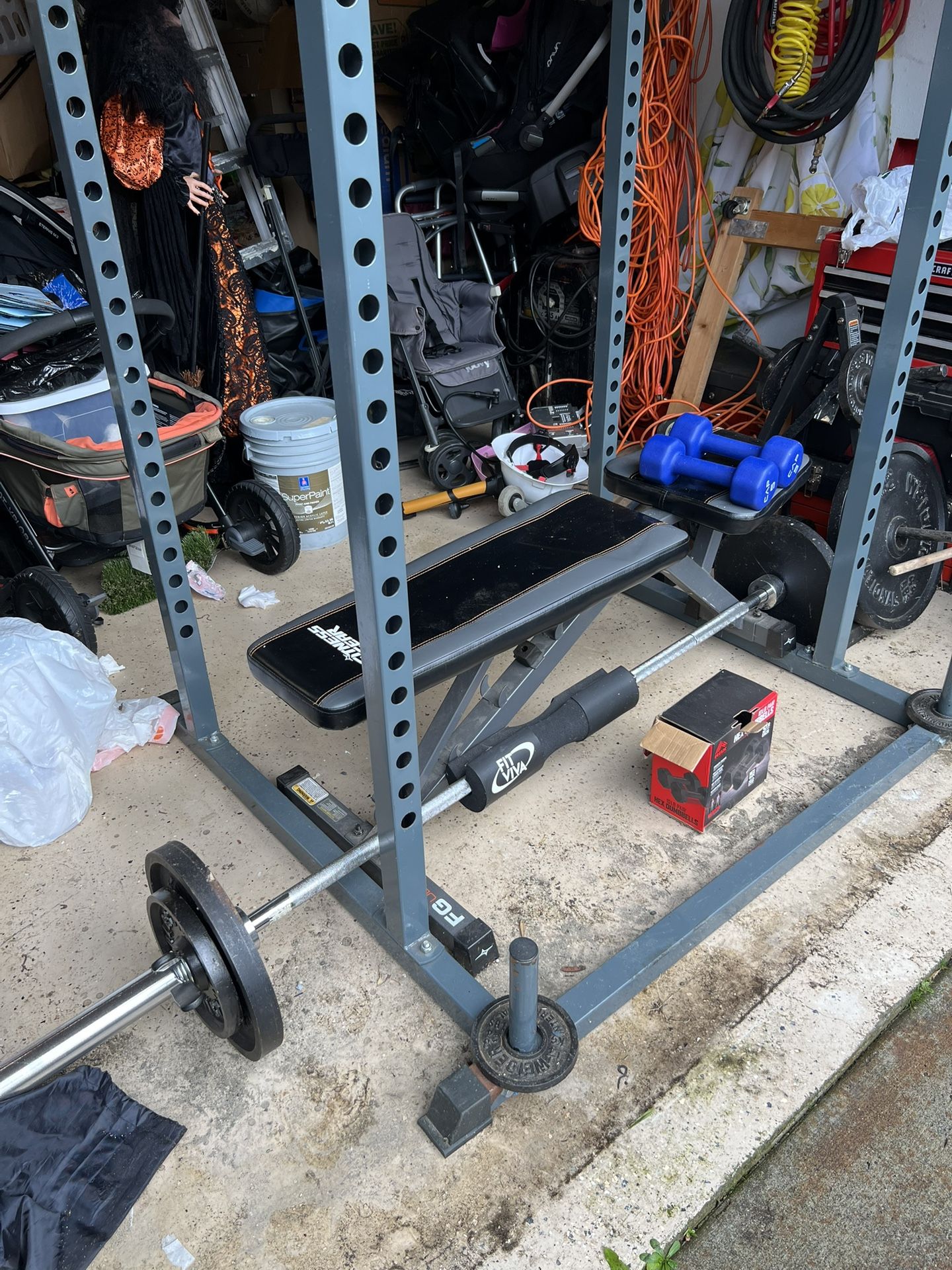 Power lifting set Includes power rack 45lb bar Reclinable bench 300lbs of weights Weight tree Squat neck cushion