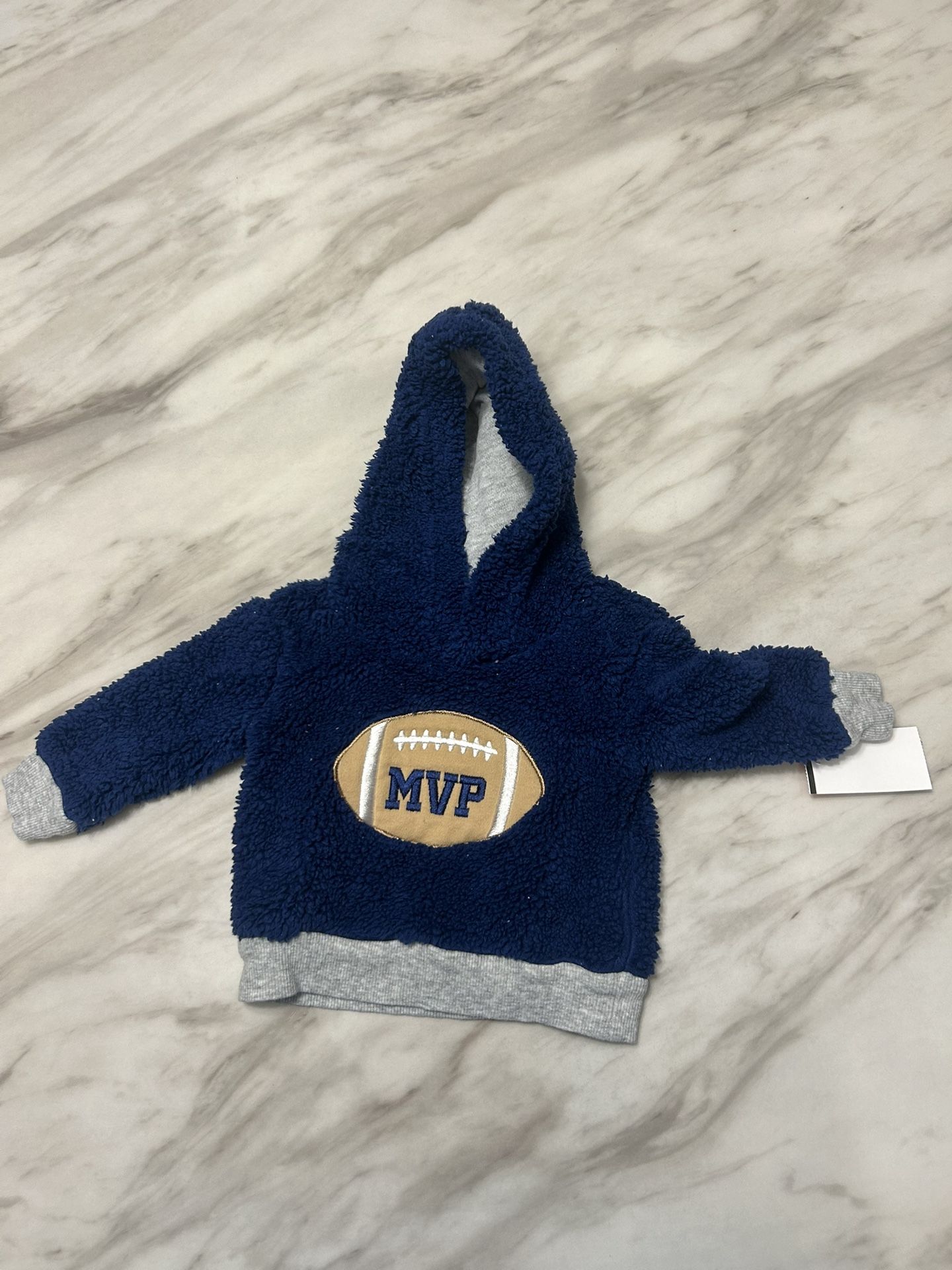 Cute baby pullover hoodie with a blue sherpa-style fabric and “MVP” football applique on the front. Features long sleeves, hood, and gray ribbed cuffs and hem. Soft, cozy, and perfect for everyday wear or game day. Size (3M)