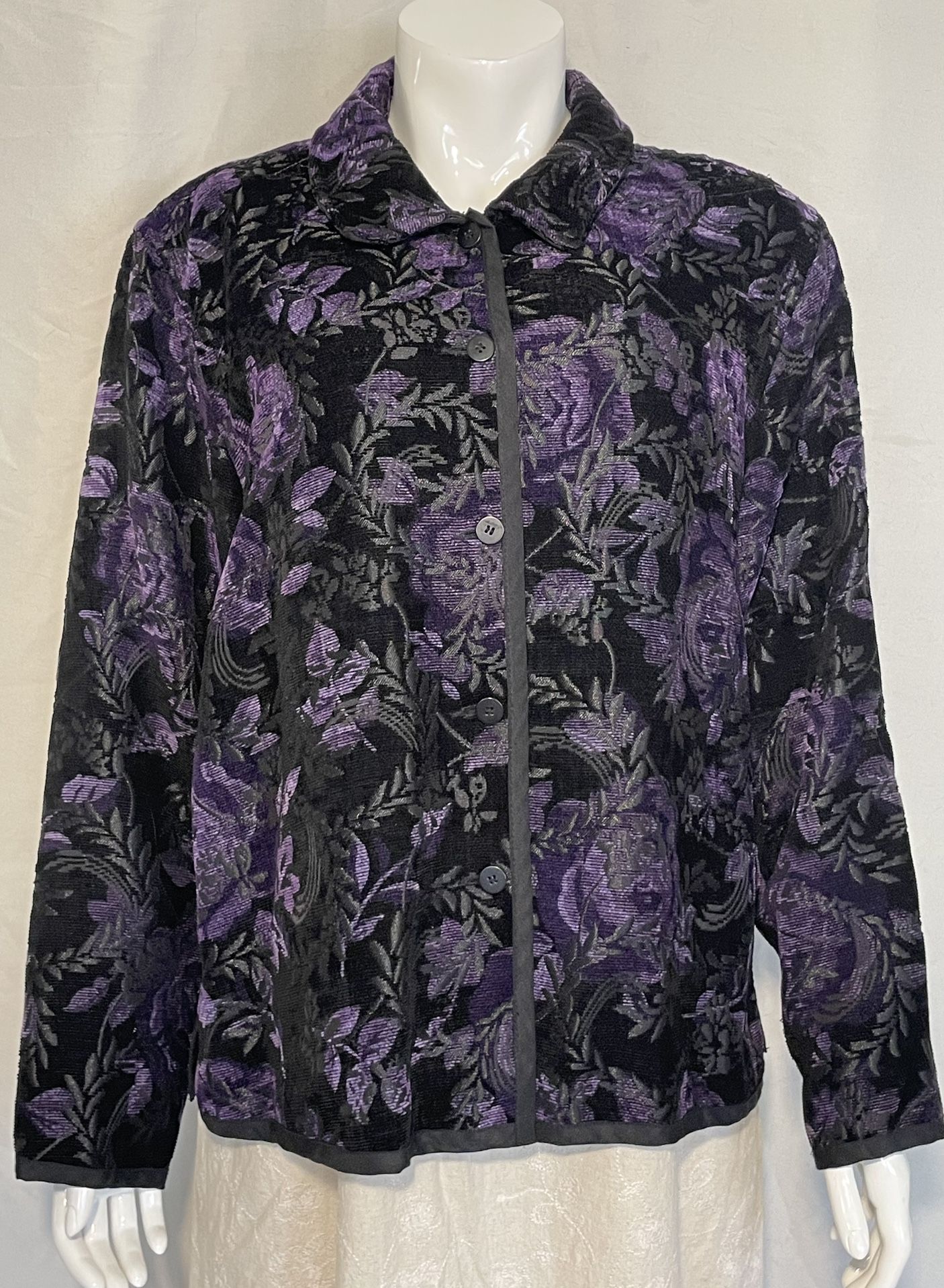 Textured black coat with purple floral pattern. Button up front. Unlined. No pockets. Location near Greenway Road and 40th Street Phoenix Arizona. Pick up only.