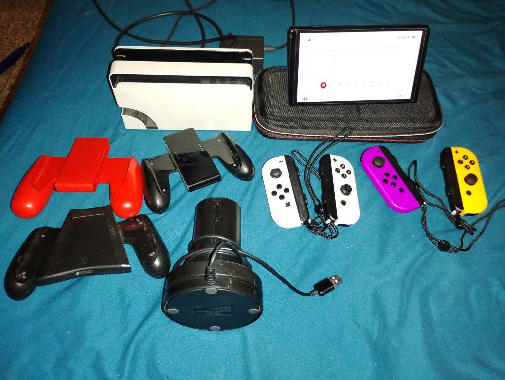 Nintendo switch OLED with extras Includes - the switch OLED, the dock, cordes, 3 joycon holder, two sets of joy cons, charging station for joy cons, caring case, and 256 mb micro SD card. Adult owned Asking $300 Located in Davenport Must pick up