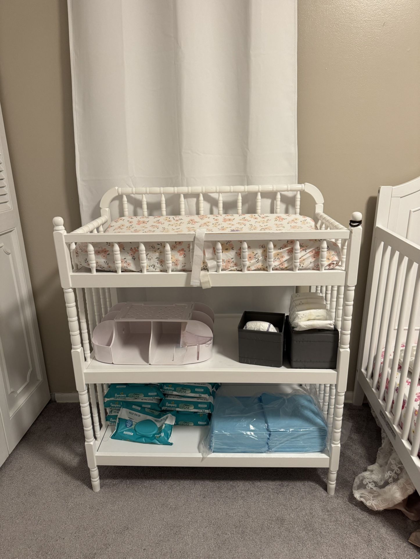 Changing table has normal use and as in great condition. Will include changing pad and white caddy with table. *Wipes, blue pads, gray organizers and diapers not included*
