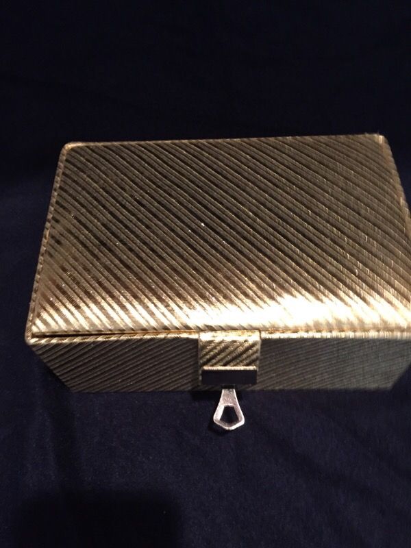 Stylish Golden Jewelry box with lift out tray. 3 section +small purse for tiny jewelry. Rings, chains, Bracelet organizers . Keep everything in its place. Linen with cotton. Includes a function lock and key. With box. Never used . Sell cash