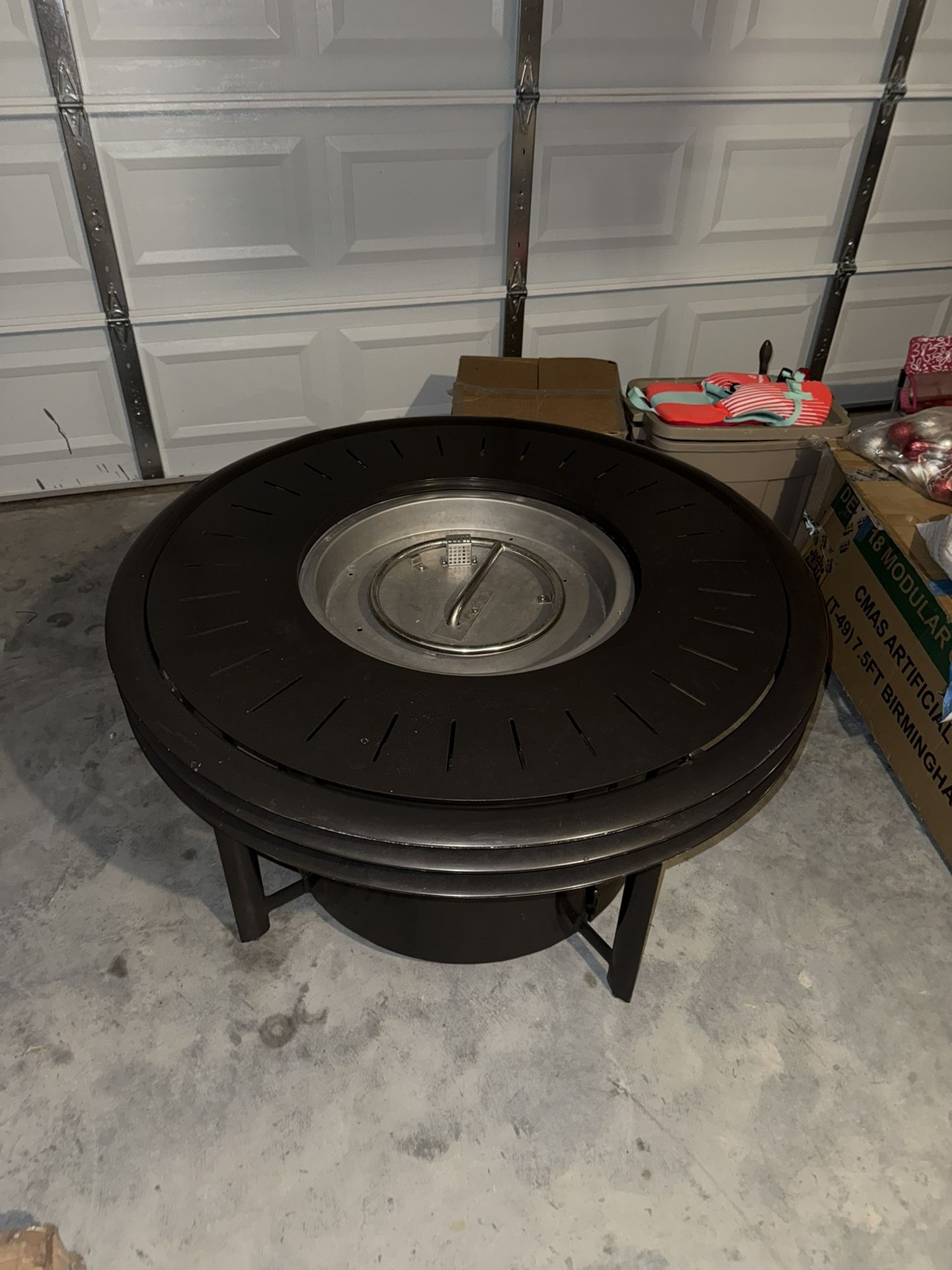 Metal round fire pit table, perfect for outdoor gatherings. Selling as is brand new never used . The bottom of the table broke but i tried to fix it but no luck and will need a welder to fix and do a small touch up on the paint. The price is fair or best offer . Ty
