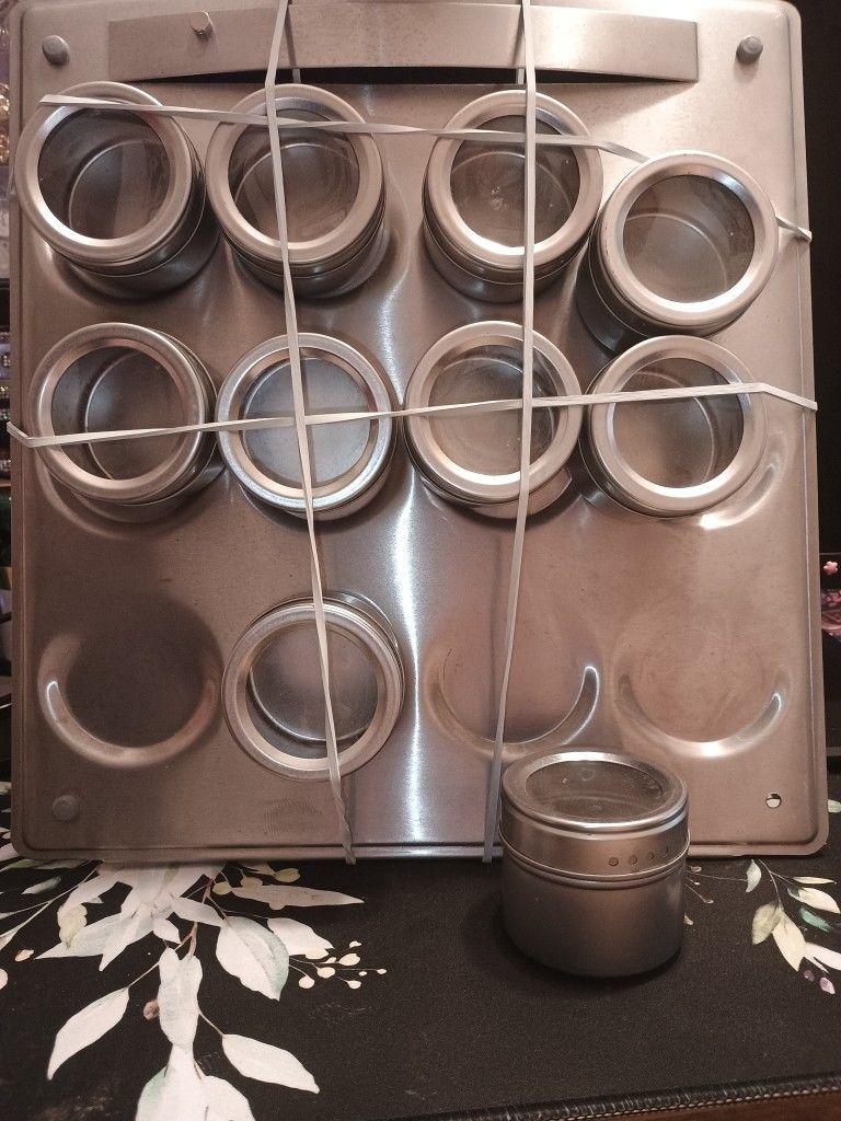 This is a metal board you can stand up or hang up it's about 12 and a half inches long and almost 14 in tall there are 10 cylinders with clear tops. This is great for arts and crafts or the office. I can also see it being used for spices in a kitchen or garage for bolts and screws.