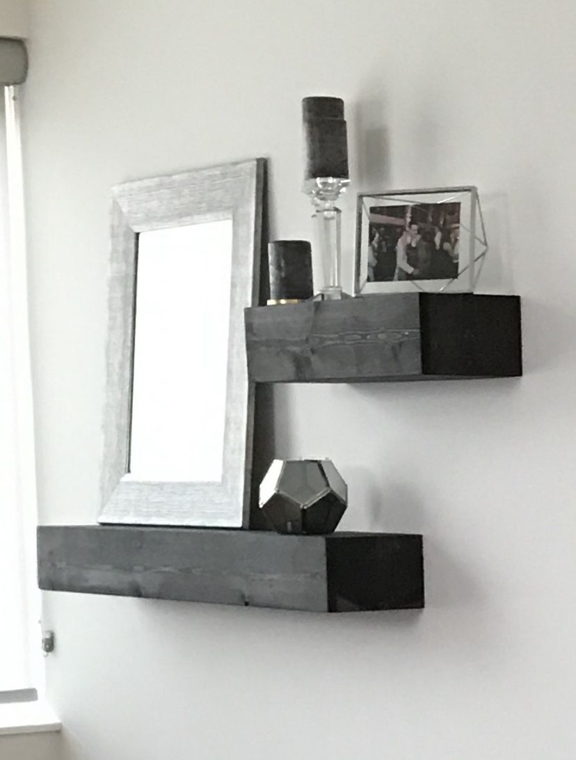 Dark grey wood floating shelves in great condition! We have absolutely loved these in our precious condos, but don’t have a good spot in our new house for them. Bought both for $200 from wayfair (now out of stock) Large one: Length 44”, Depth 8inch, height 5.5” Small one Length 22”, Depth 8inch, height 5.5”