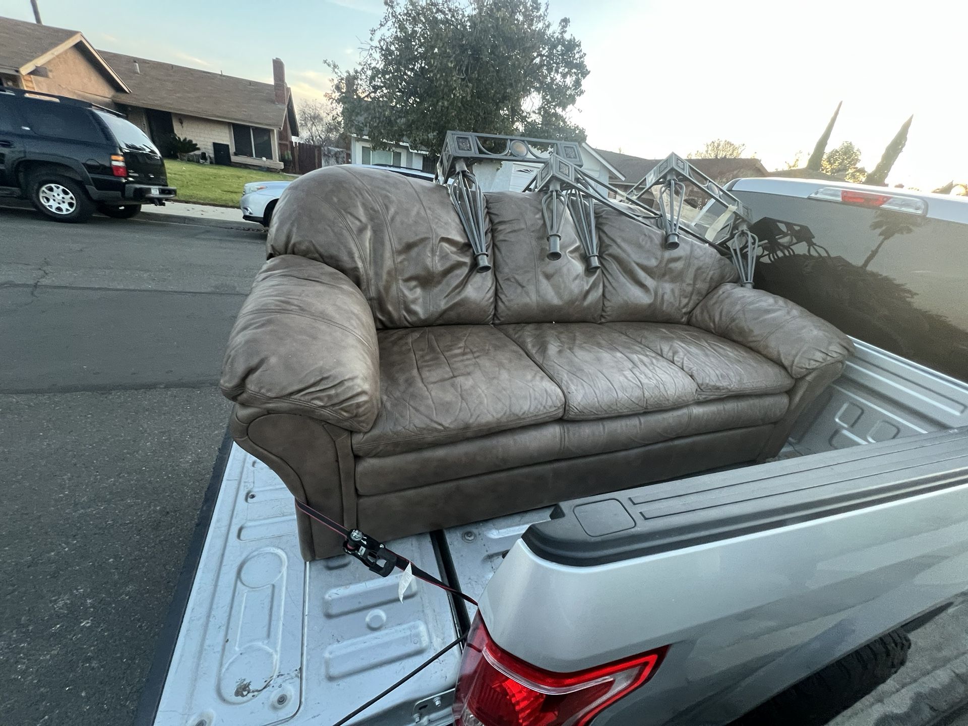 Leather couch sits 3, small tears show in photo