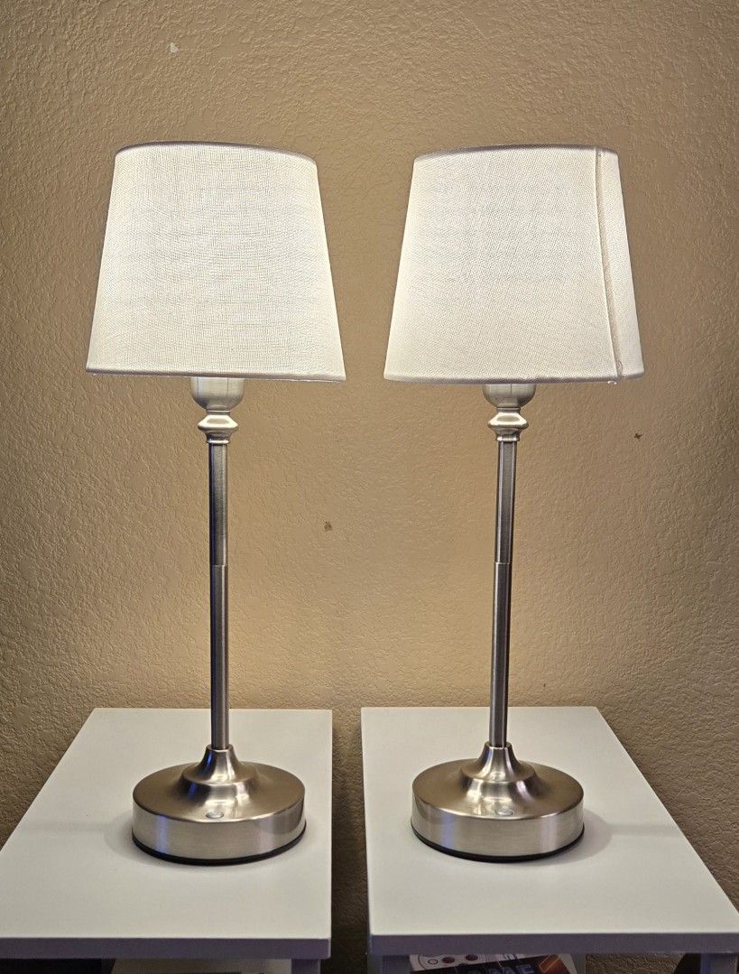 Cordless Table Lamps Rechargeable Set - 2 Pack Silver 4000mAH Battery Operated Lamps for Decor, 3000K Stepless Dimming Touch Control Wireless Lamps for Bedroom, Dining Table, Living Room, White Shade Like new and in box very little Assembly required and has bulbs. Pick up only 85041 zip code. Cash only