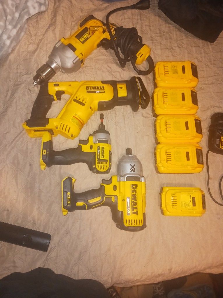 20V MAX XR Cordless Brushless 1/2 in. High Torque Impact Wrench with Detent Pin Anvil, 20V MAX Cordless Compact Reciprocating Saw, 1/2 in. VSR Pistol Grip Drill with E-Clutch Anti-Lock Control 20V MAX Cordless 1/4 in. Impact Driver DCB205BT 20V MAX* 5.0Ah XR Lithium-Ion battery with integrated Bluetooth Qty 4 20V MAX Lithium-Ion 6.0Ah Battery One dewal battery charger