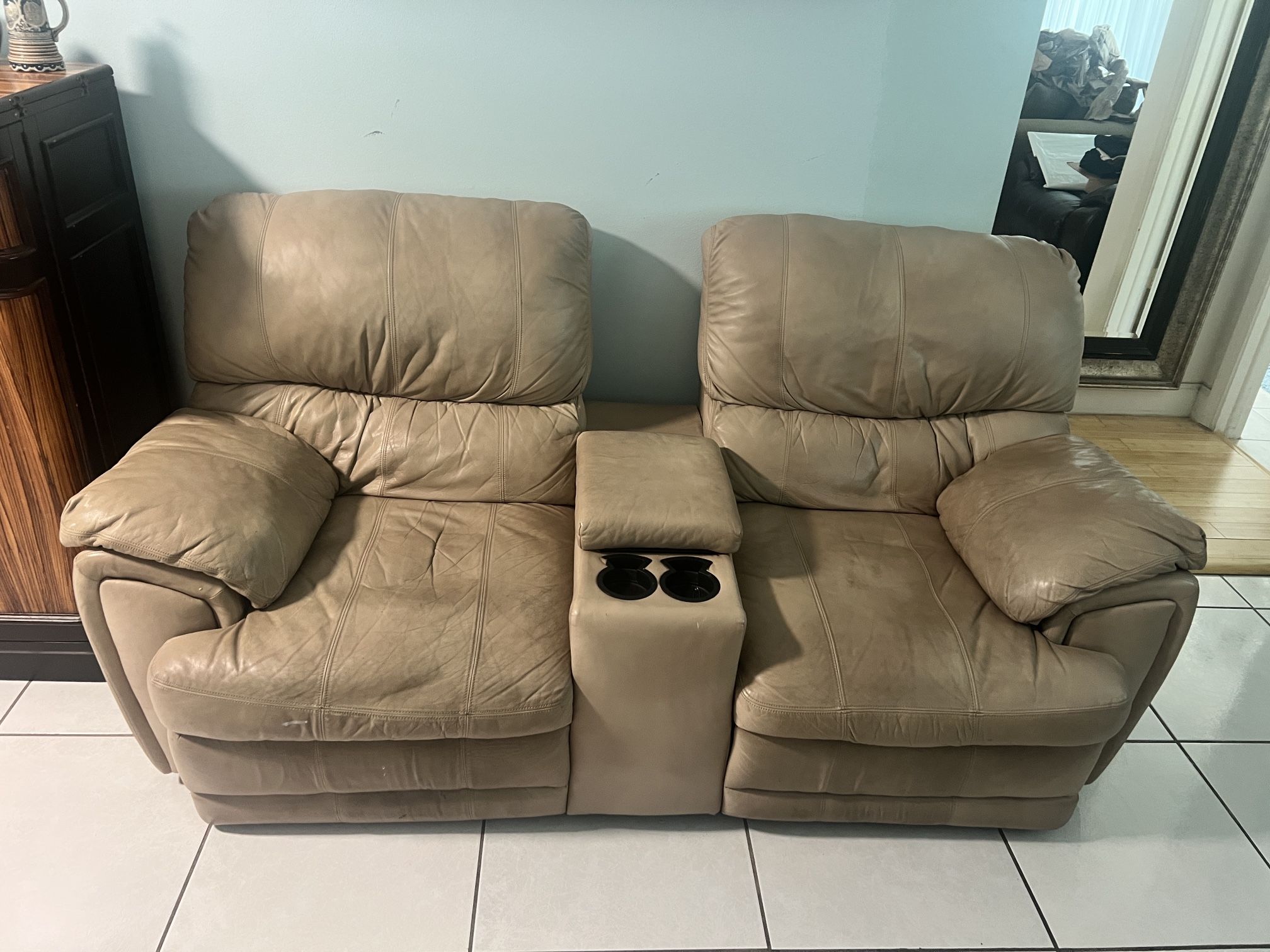 Selling this beautiful Leather Double recliner Fully functional end extremely comfortable. It comes with a. Storage compartment in the middle. One of the screws on the latch is loose and needs to be re threaded.