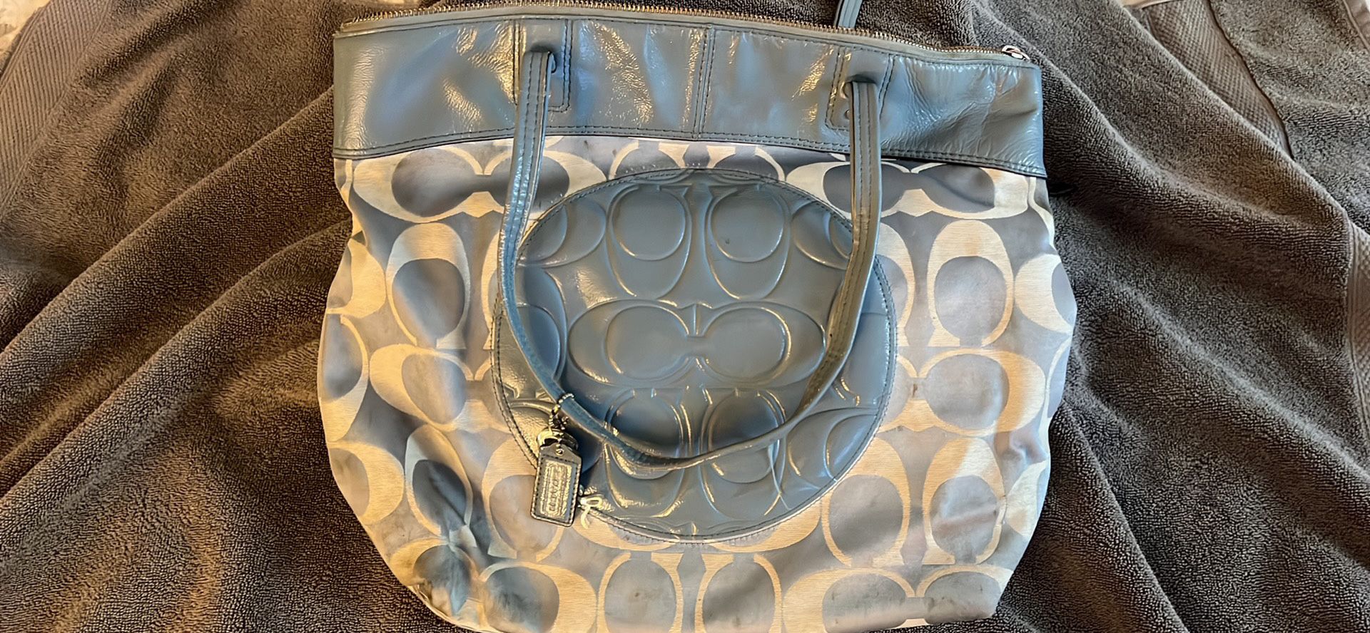 Light blue genuine COACH tote. Some light stains, slight wear on straps (shown in pics)
