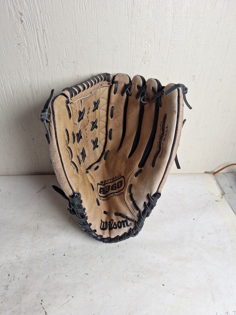 Size: 14" For the RIGHT-HANDED thrower. Glove is 100% broken-in Great for fast or slow pitch. Closed web. Genuine leather. Split hinge. Velcro Wrist closure.