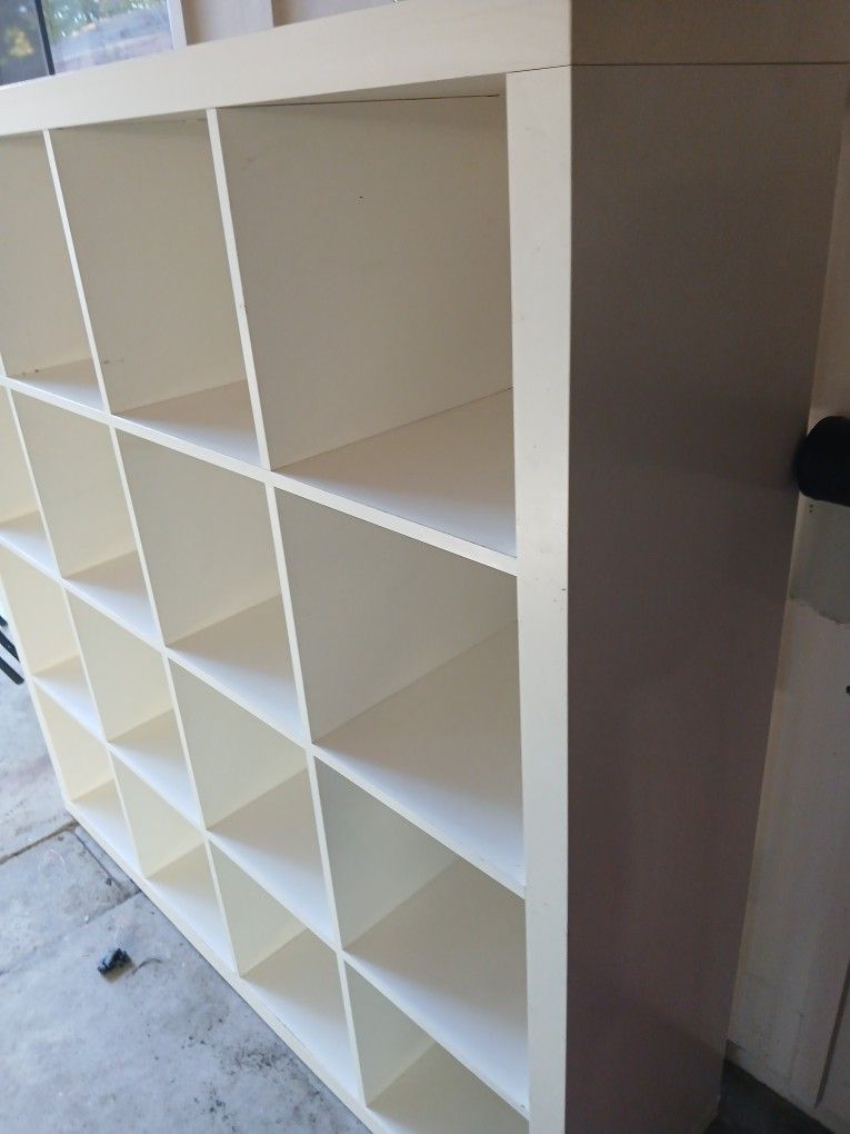 Large white Stacked Shelves. Used but decent condition. Dimensions: Length 59 inch x Width 15 inch Height 59 inch. Plastic wood material.
