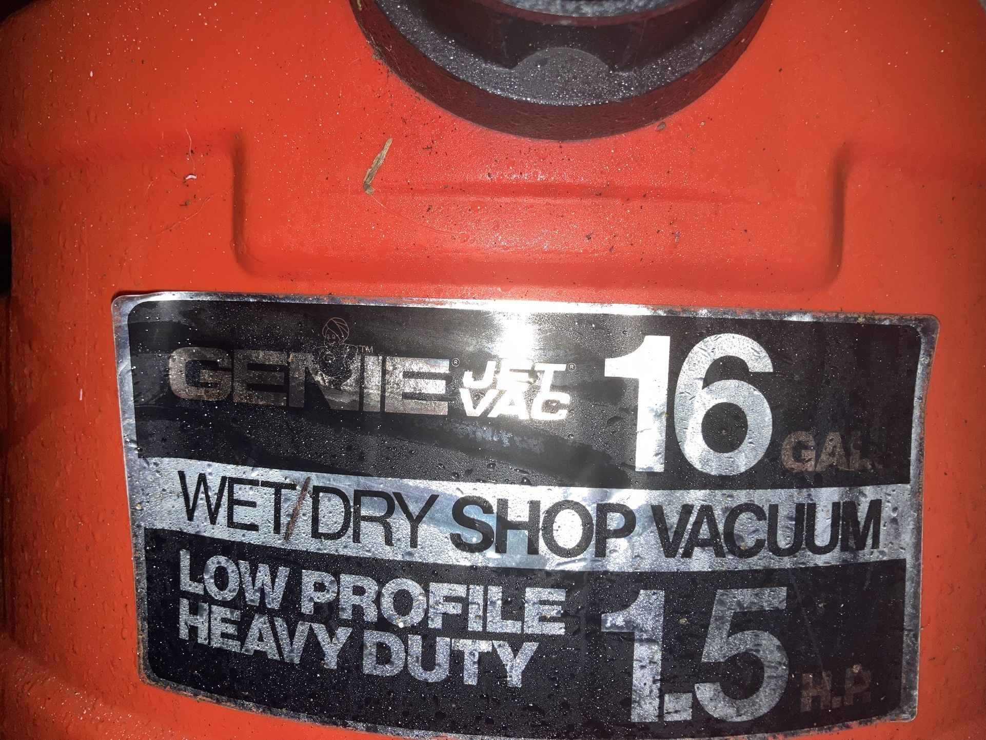 Used a Genie 16-Gallon, 1.5 HP Wet/Dry Vac is a heavy-duty cleaning tool for home, garage, or job sites, handling both wet spills and dry debris, often featuring blower function, a durable tank, drain for liquids, and attachments like wands, nozzles, and filters, though it's essential to switch filters for wet vs. dry use and drain liquids before dry pickup. While the brand "Genie" might be less common now, it's similar to popular heavy-duty models from Wet & Dry: Picks up liquids and solids; requires filter changes or removal for wet pickup. For Dry Debris: Ensure a filter (or dust bag) is installed for dust containment. For Wet Spills: Remove the dry filter and install the foam sleeve or no filter (check manual) for water pickup. Attachments: Connect hose, wands, and nozzles as needed for reach and specialty cleaning. Emptying: Use the drain plug for liquids or remove the tank lid for solids/bags.