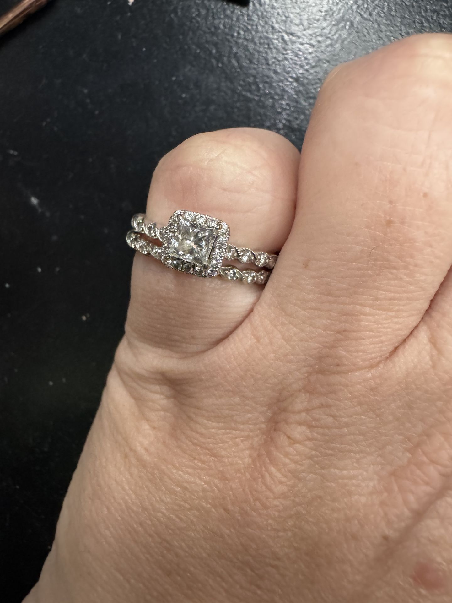 3/4 carat tw princess and round cut 14k white gold bridal set Screenshot of ring on Kay’s website - pre-owned for$1349.50 for just engagement ring, not including matching wedding band. Had warranty through Kay’s and professionally inspected and cleaned every 6 months.