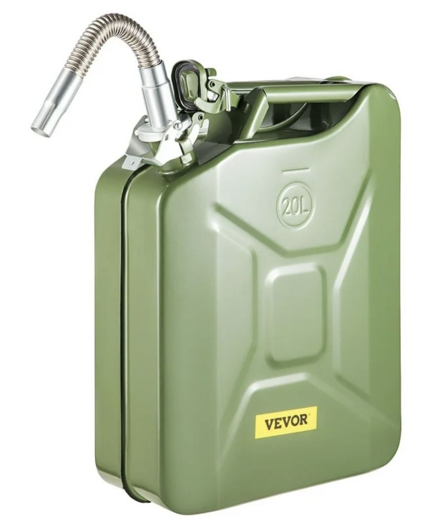 VEVOR Jerry Fuel Can, 5.3 Gallon / 20 L Portable Jerry Gas Can with Flexible Spout System, Rustproof & Heat-resistant Steel Fuel Tank for Cars Trucks Equipment, Green Highlights: 1.Fill Up Anytime: Still lining up in a long queue for refueling? Had to push your car because you were out of fuel? Our jerry can is the perfect thing to prevent those events. It stores 5 gallons of sufficient fuel for you to reach your destination. Put our jerry can in the trunk and never again run out of gas halfway through the trip. NOTE: THIS PRODUCT CANNOT BE SHIPPED TO CALIFORNIA, USA. 2.Military-style Jerry Can: Seamlessly welded with 0.8-mm thickened cold-rolled steel, this military-style jerry gas can is sturdy enough to bear a grown man's weight. It is coated with rustproof green paint and has a concave bottom edge that significantly reduces wear. Store your fuel safely for the long term. https://offerup.com/redirect/?o=My5Obw== Leaks No Fumes: The unique cap with an airtight sealing gasket seals completely, so it allows no leakage or fumes to escape even set flat on the back seat. The anti-slide locking pin further secures the latch, making it unlocked only with manual operation to prevent accidents. 4.Bendable Spout for Every Drop: Unlike some short spout on the market that is rigid, we provide you with a 12 in / 300 mm long flexible spout that can be bent to any angle. The spout mechanism allows you to pour out the fuel at a high flow rate and refuel your vehicle in no time. 5.Portable Design: This fuel tank is equipped with ergonomic handles for two-man lifting to make refueling easier. It has a compact size of 13.6" x 6.7" x 18.5" (L x W x H), making it an ideal container for storing a large volume of oil. Additionally, it takes up little to no space in your car.