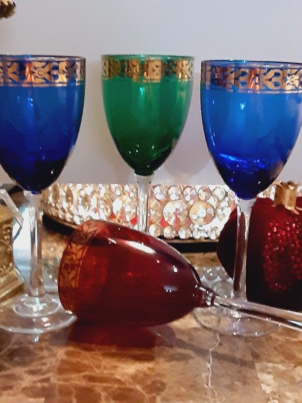 This is a set of 4 vintage wine colored glasses. They all have rich colors. The glasses have elaborate golden patterns. They have never been used, just for the decor in the curio cabinet. Firm on price.