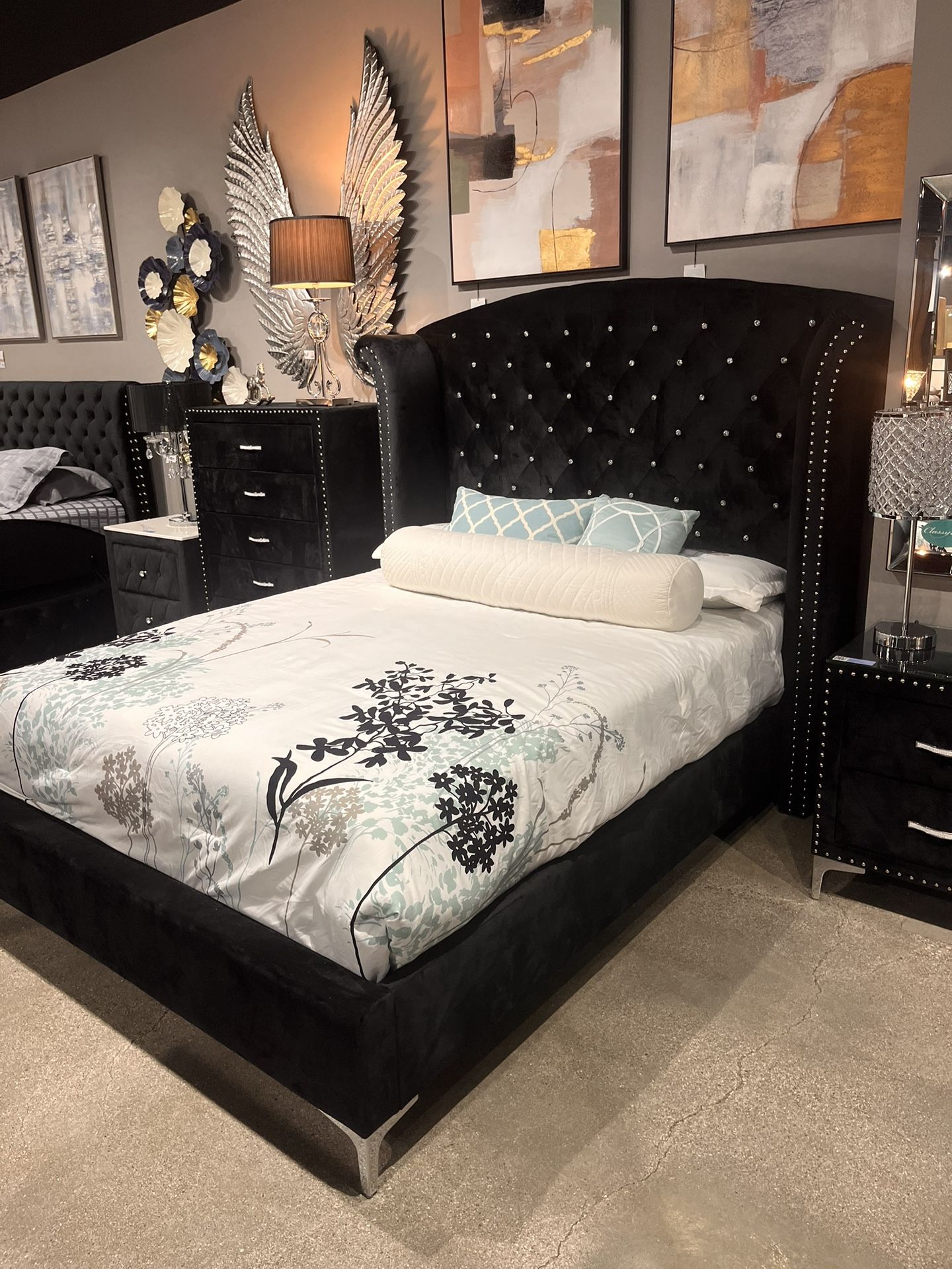Queen or king size available Black velvet fabric material bedroom set Comes with 1 night stand, dresser mirror bed frame King size $100 more Mattresses from $199 queen set $25 initial payment take it home no credit needed Hablamos español We can deliver