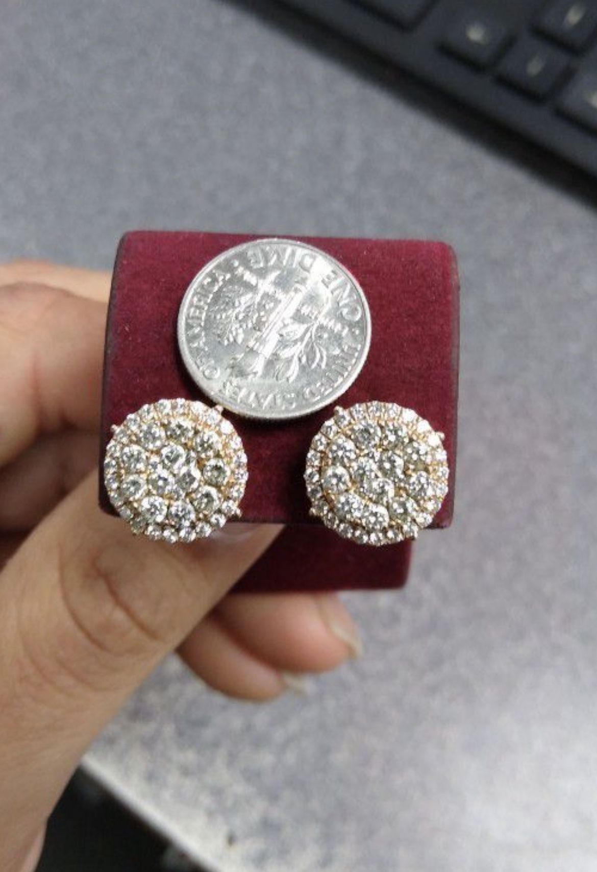 Large 10k diamond earrings . 1.45carats of diamond. 10mm wide . Screw back . Purchased from Johnnys . Retail $1400 Hablo español