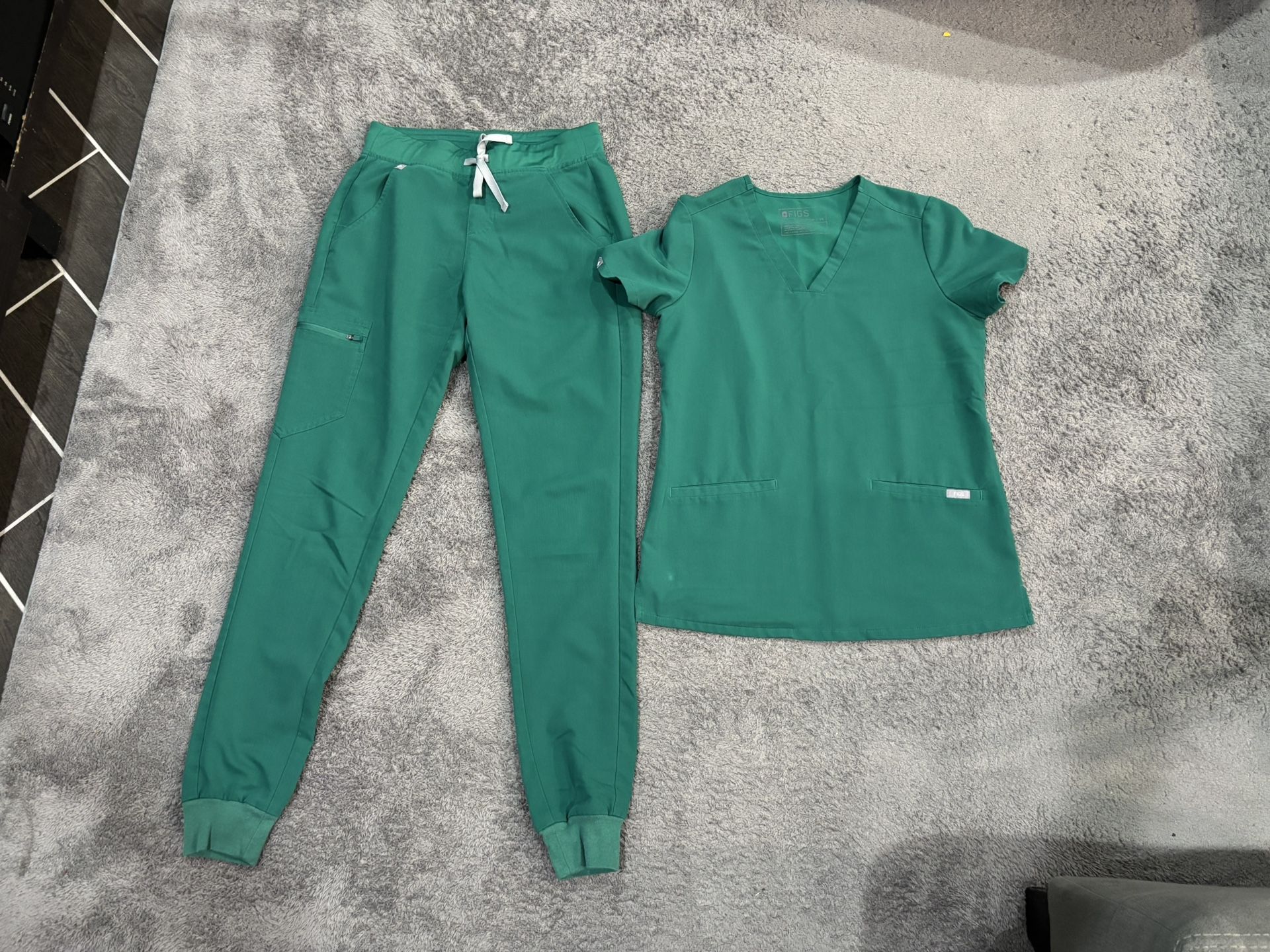 XS/T FIGS Hunter Green Scrub Set. In great gently used condition. Small white stain on front right bottom shirt as seen in images.