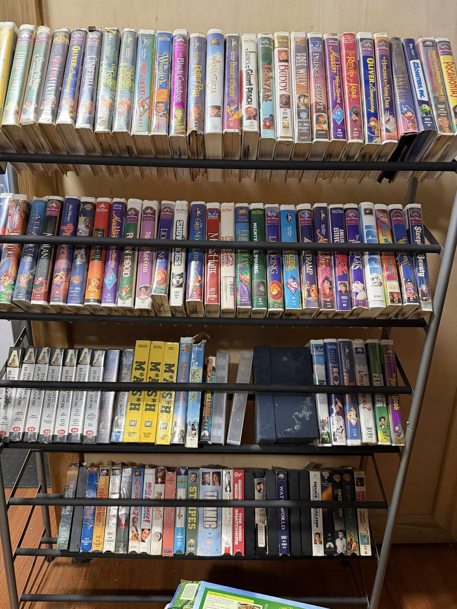 50+ vhs tapes in used condition. Disney, Mash, Carol Burnette show plus lots of extras! Must take all (includes shelf!)