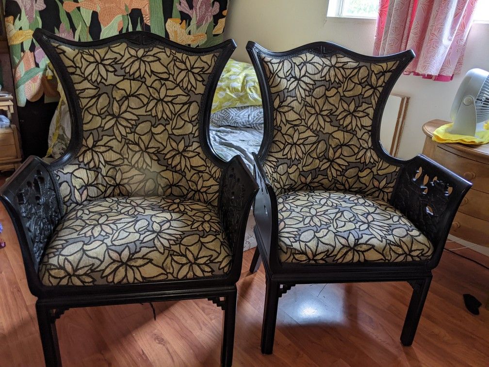 Beautiful, unique, set of chairs Judging from the burlap underneath I would guess around 100 years old, so do not expect perfection Asking $400 for the pair but make an offer! Still available if post is still up!
