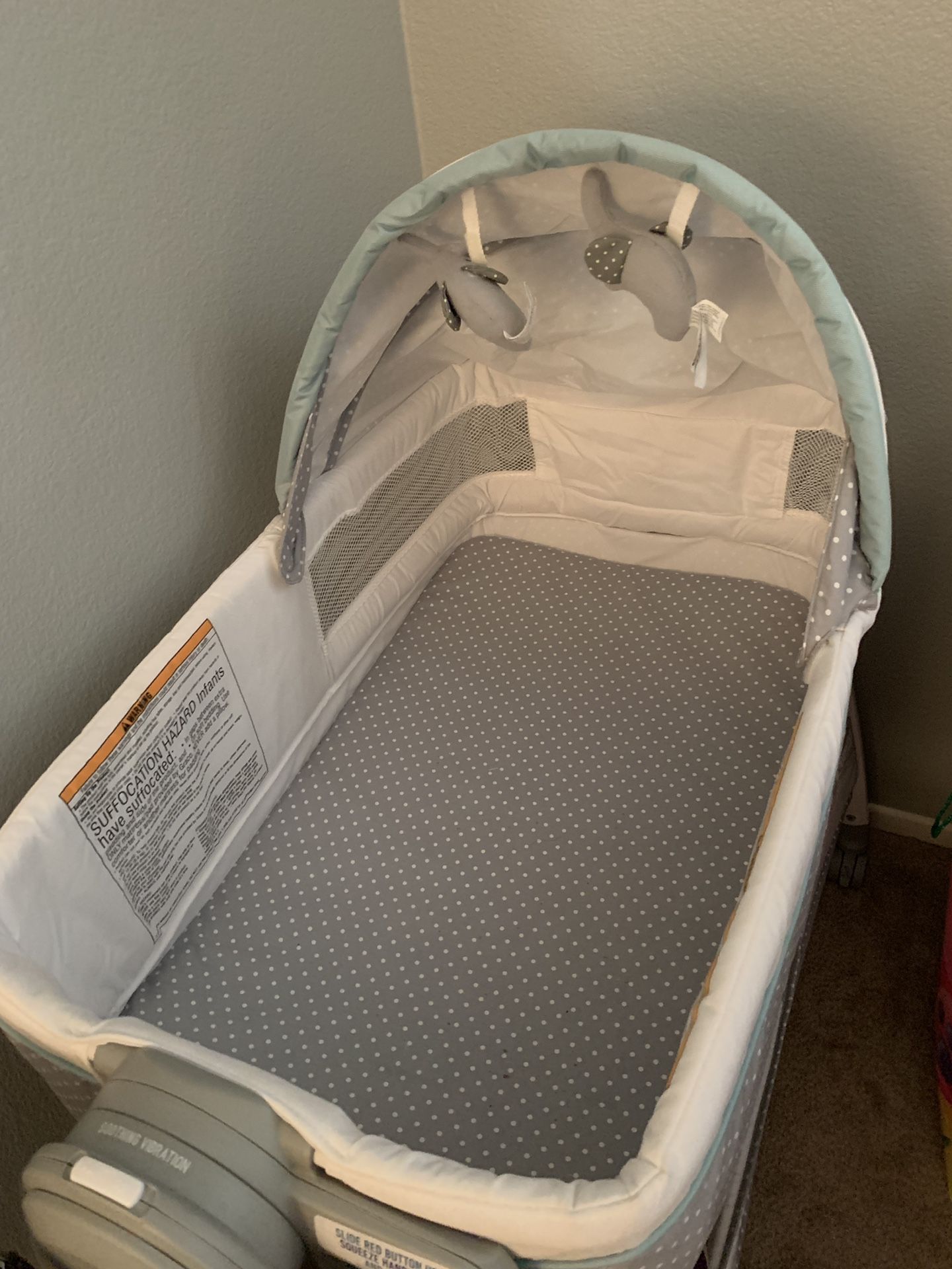 Graco grey/mint(teal) bassinet that flips to be a changing table, has storage under and wheels. It has can also vibrate to help soothe. Great condition, looks brand new, also have Manuel. Open to offers