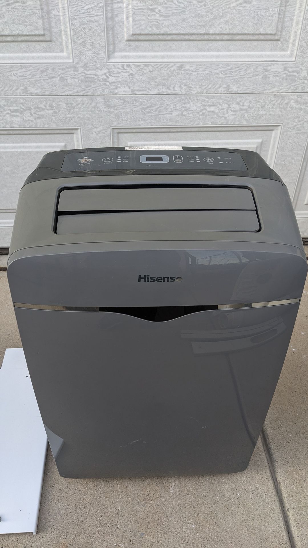 Hisense portable air conditioner in good working condition. Cools fast and works great for bedrooms, apartments, offices, or small living spaces. Features: 10,000 BTU cooling power Ideal for rooms up to ~300 -350 sq ft Air conditioner, fan, and dehumidifier modes Digital controls with remote Multiple fan speeds Quiet and efficient operation Easy to move with built-in wheels Includes: AC unit Exhaust hose Window installation kit Plugs into a standard outlet. Simple setup — just vent through a window and enjoy cool air. Can deliver for a fee depending on location