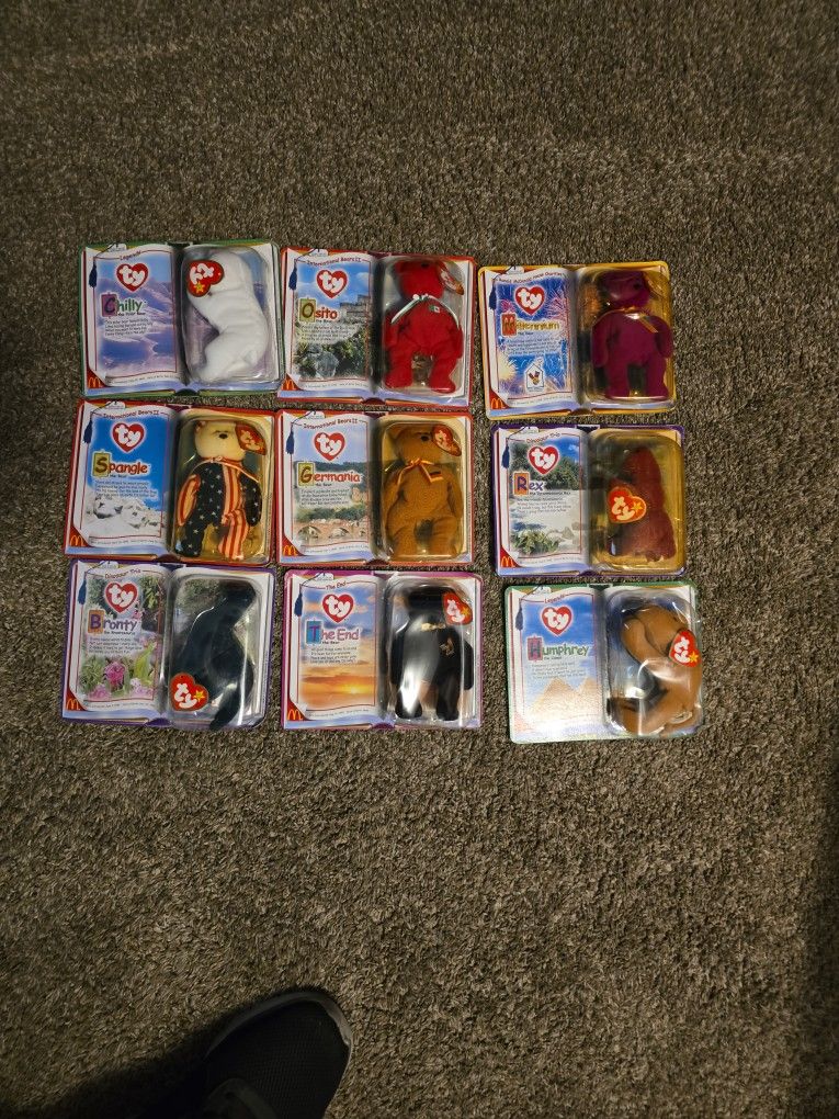 The nine Beanie Babies on card see pictures for details these were released I believe in 2000 so there are 25 year olds asking $125 problem or best bet pick up in Turlock no hold trade see pictures for detail