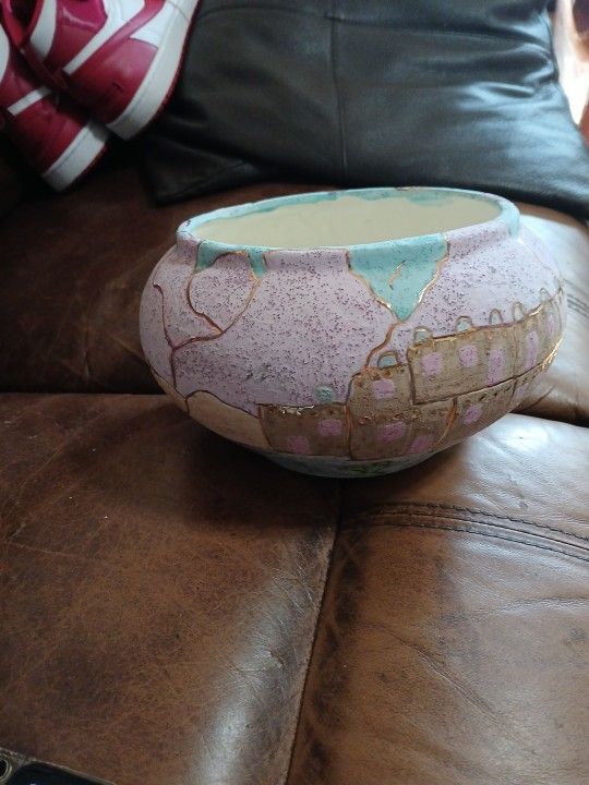 - features a textured purple and pink finish with a Pueblo or Adobe village scene - it has a light blue accents and gold- toned outline - has a combination of glossy and textured finish finished - signed by artist C. Davis 1991