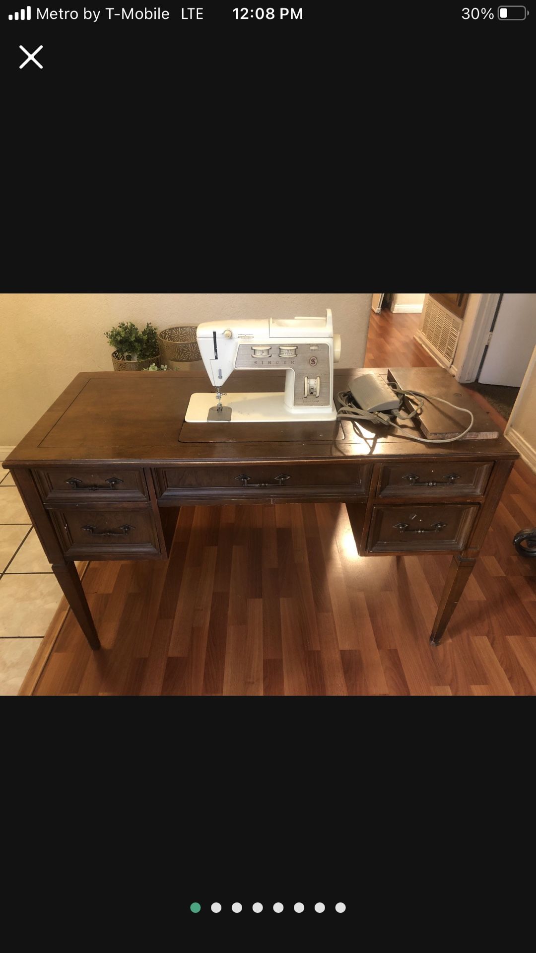 In very good condition singer sewing machine. It comes inside the desk. You can put it down or bring it up to work. Very nice. Sewing machine works pretty good the table in good condition It does come with some attachments show in the picture make me a offer