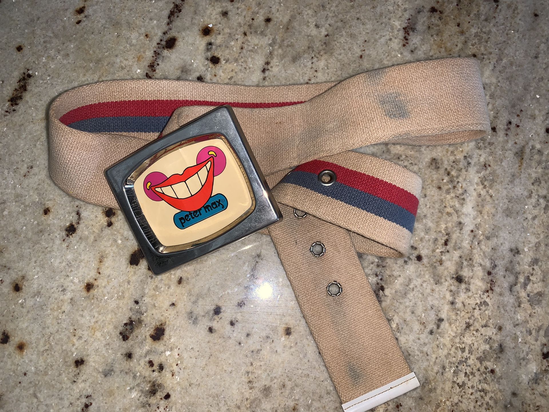 SIZE: LARGE ITEM #: 5932036 This is an AMAZING & RARE Peter Max Belt. It is used and does have some marks on it (refer to pictures.) I HAVE NOT tried to clean this belt so I’m sure it can be cleaned. Great collectors item!