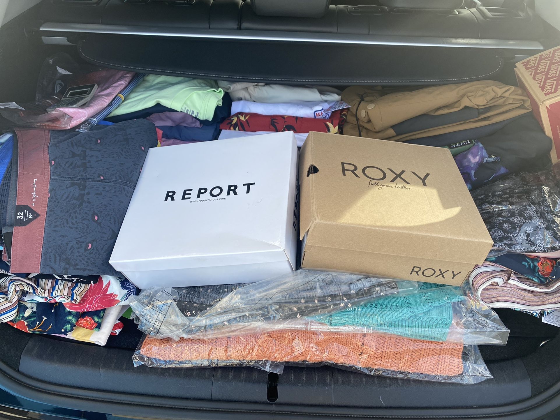Have all kinds of Clothes from shorts sandals pants & blouses and Jackets W/proof There from XXL,L,M & S shirts Men Boys and Girls Sandals 9 8 7 and 6 Selling the whole bag for $450. And Box fill with two piece bathing suits I’ve counted 75 pieces and stopped there’s about close to 200 or more pieces of clothes and questions ask I added the shirts and shorts came up to $1528.00 I got tired