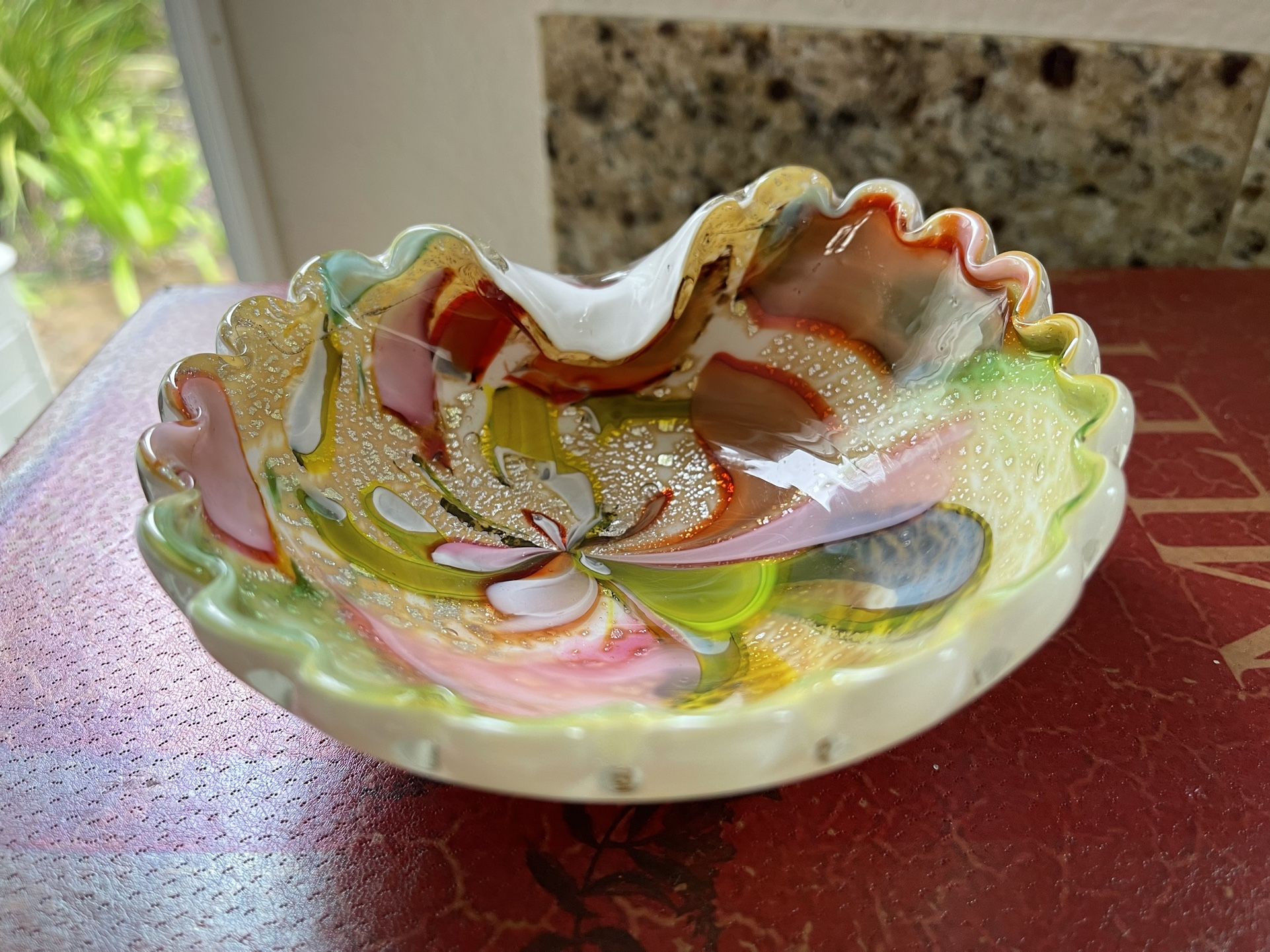 Beautiful catch all decor piece. White Tutti Fruity bowl with splashes and silver aventurine specks Pre- Owned Weights 14 0z Vintage and one of a kind since this is a handmade piece. Handmade piece with slight imperfections typical of hand made pieces of an art glass studio